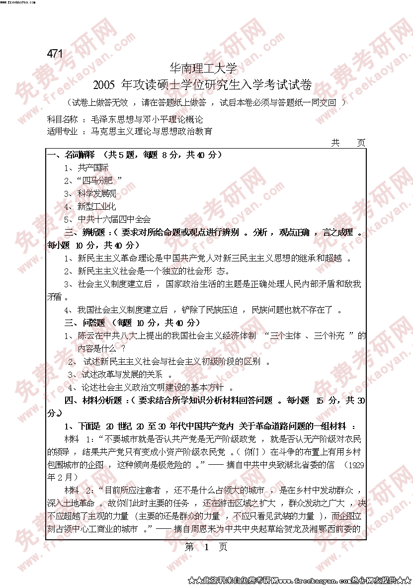 华南理工大学2005年考研真题-毛泽东思想与邓小平理论概论