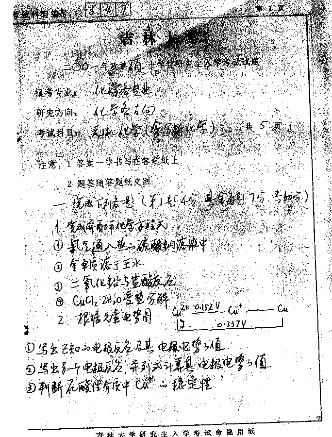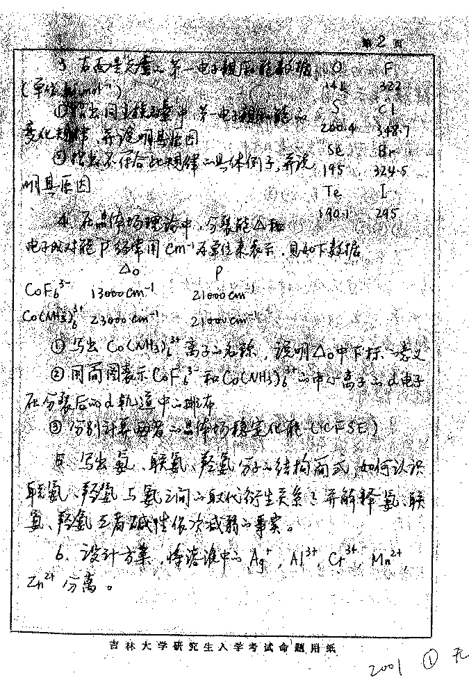 吉林大学2001年考研真题-无机化学(含分析化学)
