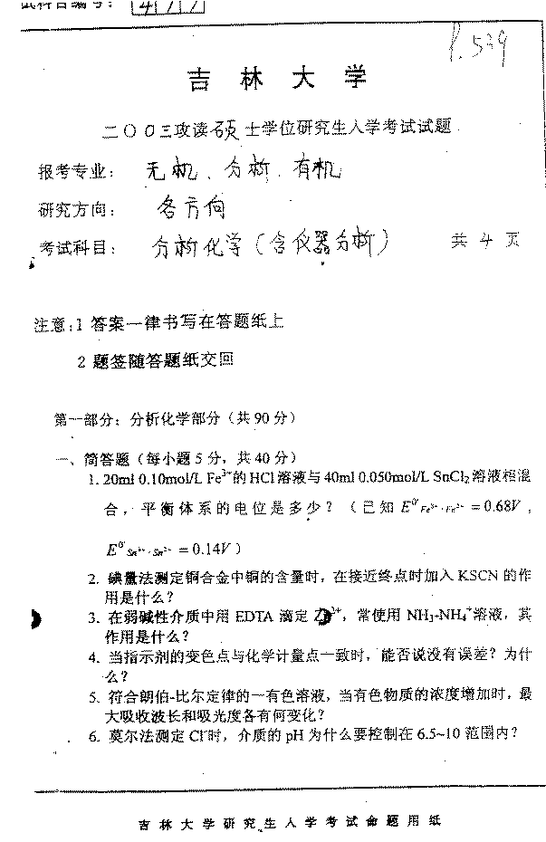 吉林大学2003年考研真题-分析化学(含仪器分析)