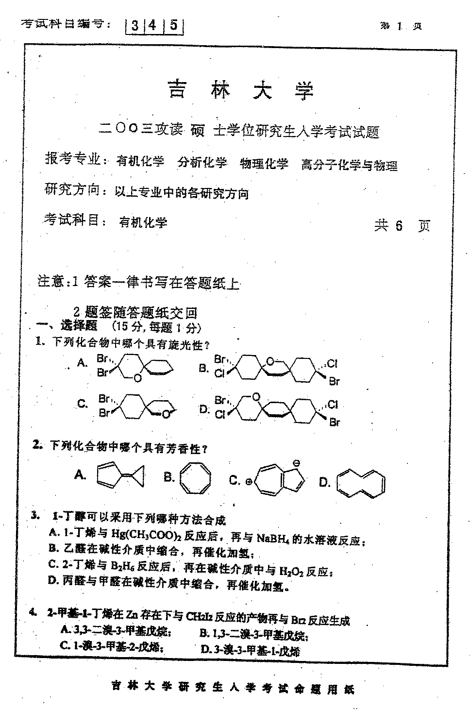 专业课考研经验 本站小编 FreeKaoyan 2018-01-22吉林大学2001年考研真题-有机化学