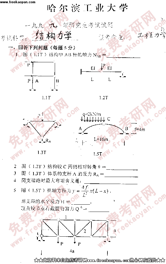 哈尔滨工业大学1999年考研真题-结构力学考研试题