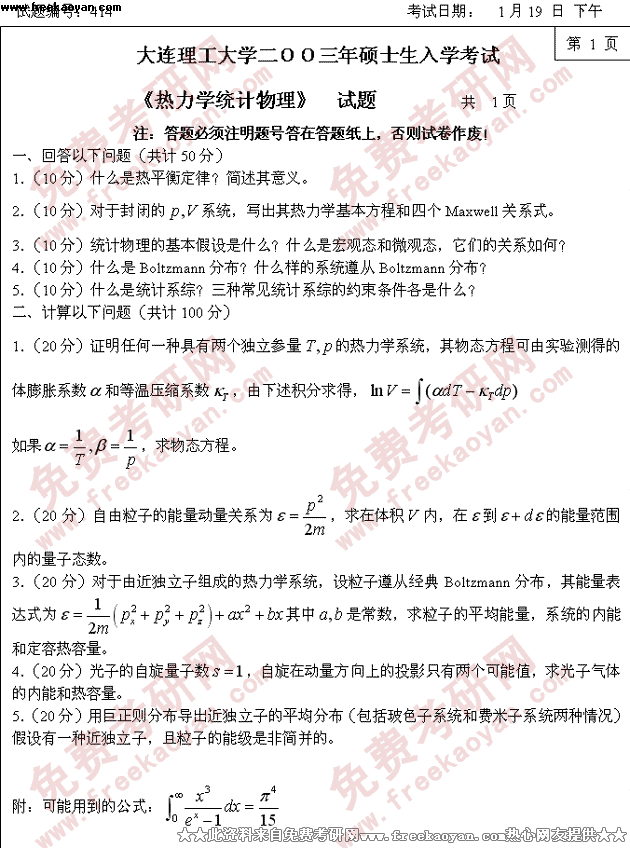 专业课考研经验 本站小编 FreeKaoyan 2018-01-22大连理工大学2004年考研真题-热力学统计物理