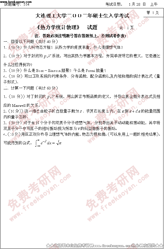 专业课考研经验 本站小编 FreeKaoyan 2018-01-22大连理工大学2003年考研真题-热力学统计物理