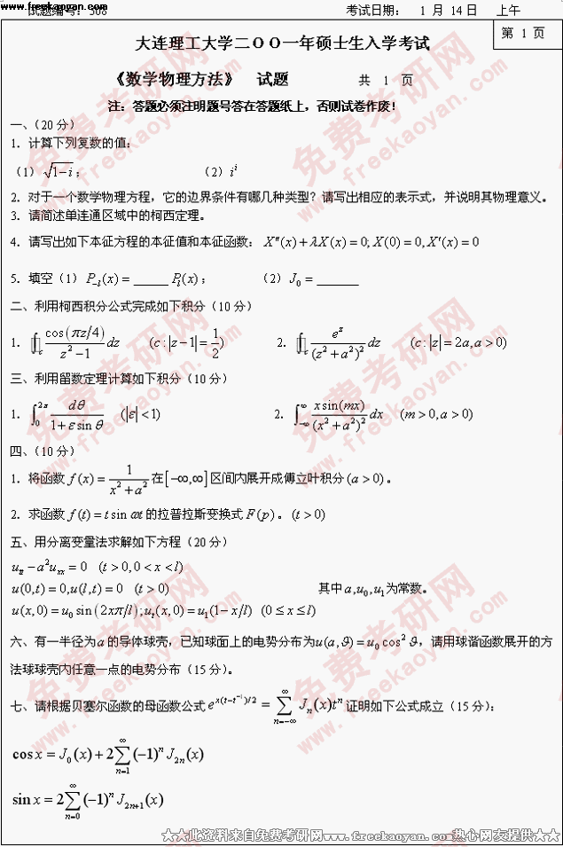 专业课考研经验 本站小编 FreeKaoyan 2018-01-22大连理工大学2003年考研真题-数学物理方法