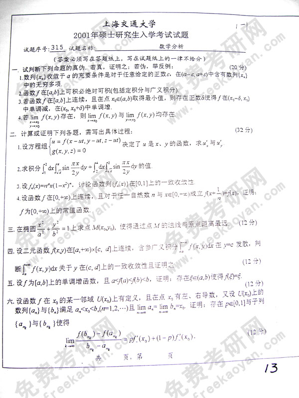 专业课考研经验 本站小编 FreeKaoyan 2018-01-22上海交通大学2000年考研真题-数学分析