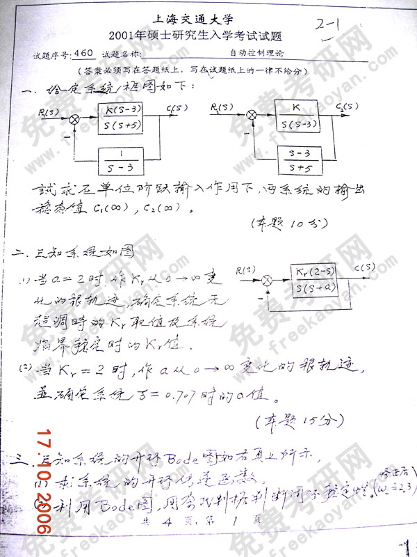 专业课考研经验 本站小编 FreeKaoyan 2018-01-22上海交通大学2000年考研真题-自动控制理论