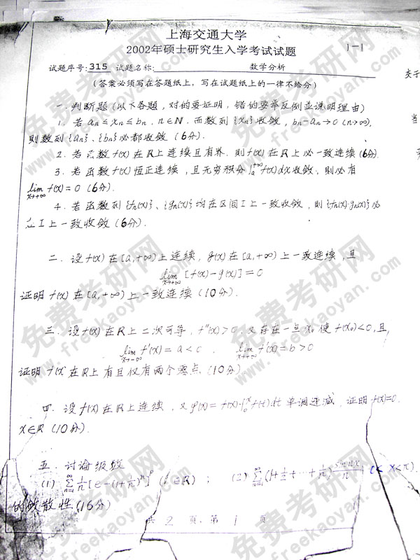 专业课考研经验 本站小编 FreeKaoyan 2018-01-22上海交通大学2001年考研真题-数学分析