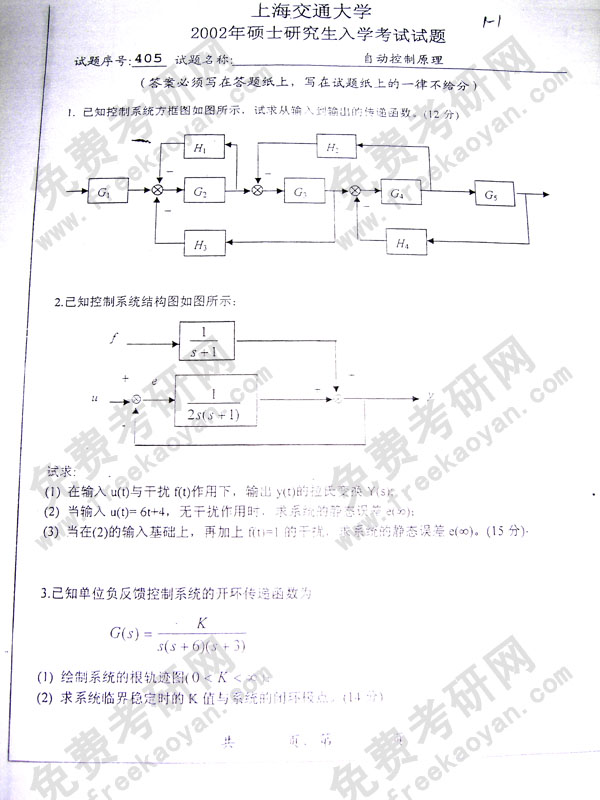 专业课考研经验 本站小编 FreeKaoyan 2018-01-22上海交通大学2002年考研真题-自动控制理论