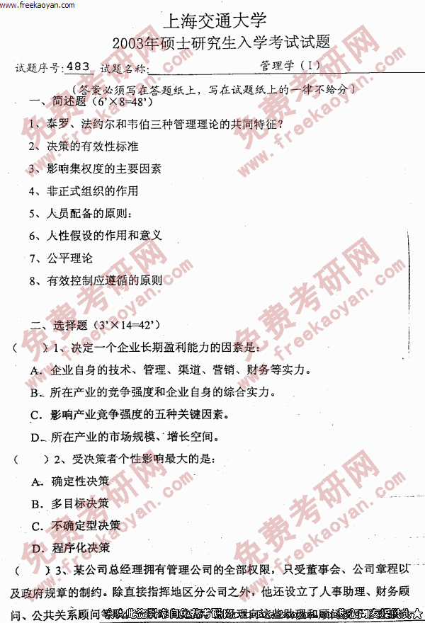 专业课考研经验 本站小编 FreeKaoyan 2018-01-22上海交通大学2002年考研真题-管理学