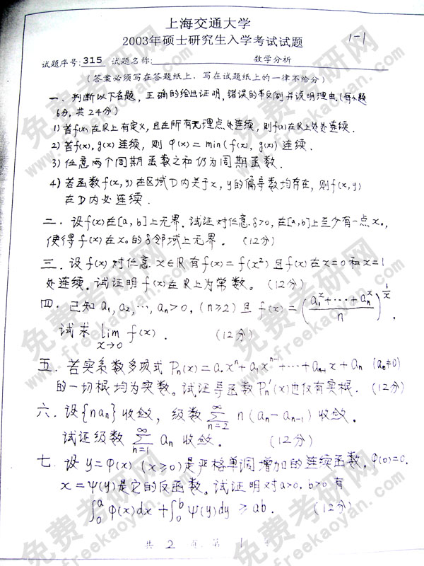 专业课考研经验 本站小编 FreeKaoyan 2018-01-22上海交通大学2001年考研真题-数学分析