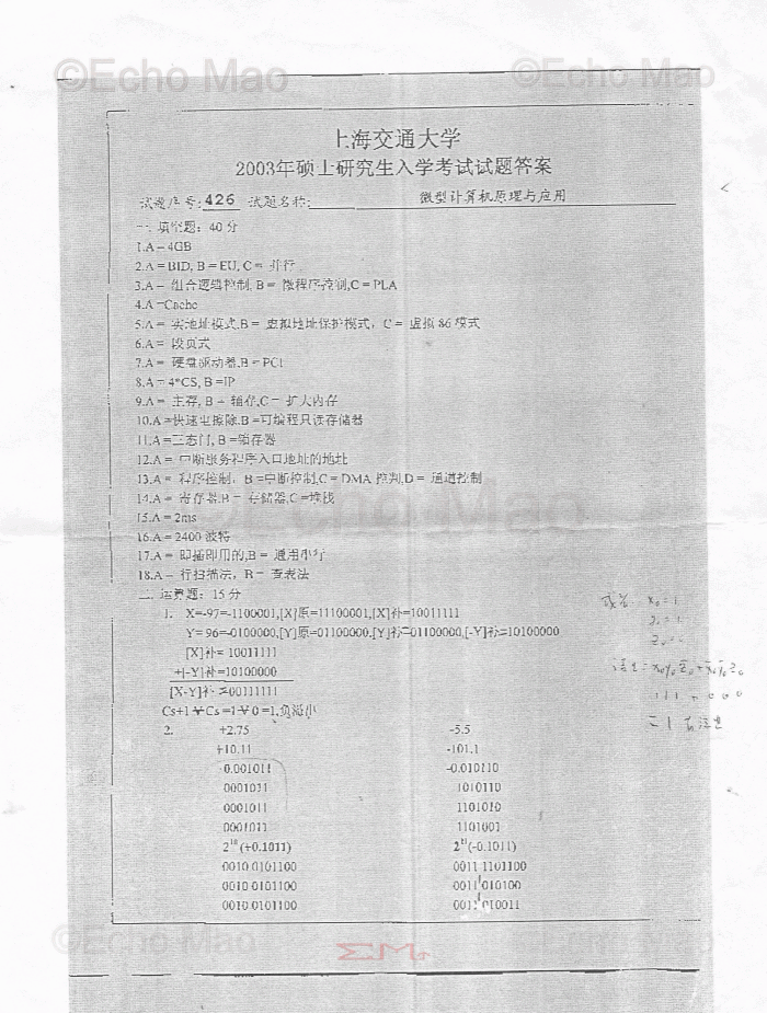 上海交通大学2003年考研真题-微型计算机原理与应用答案