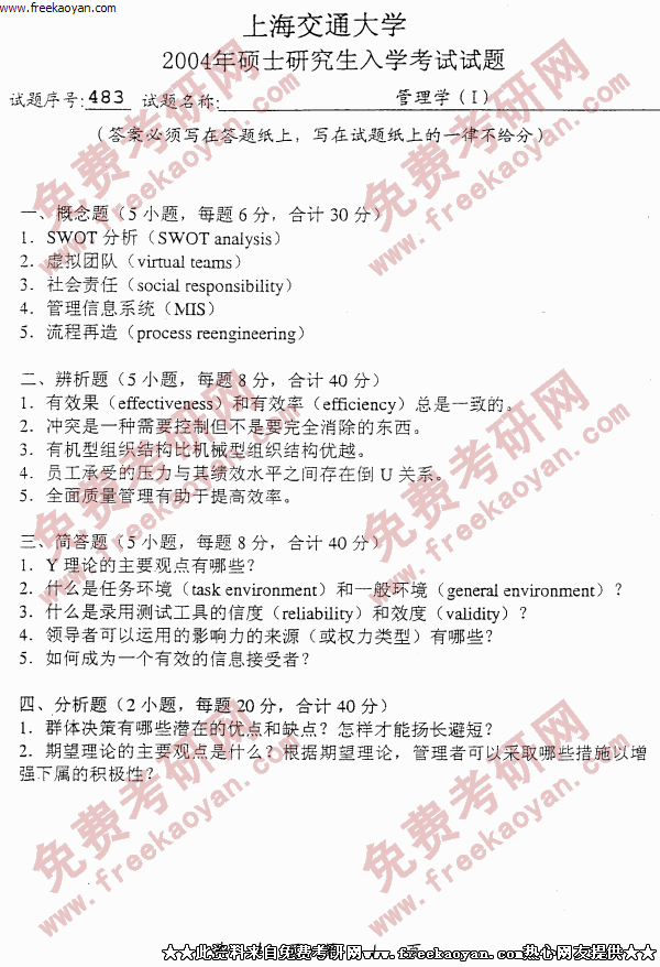专业课考研经验 本站小编 FreeKaoyan 2018-01-22上海交通大学2003年考研真题-管理学