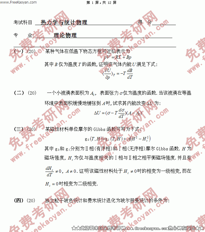专业课考研经验 本站小编 FreeKaoyan 2018-01-22南京大学1998年考研真题-热力学与统计物理
