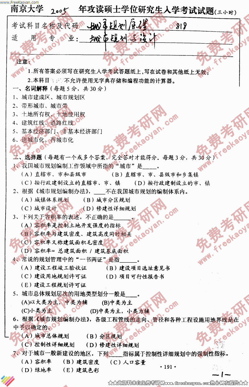 专业课考研经验 本站小编 FreeKaoyan 2018-01-222005年中国近代史 一. 名词解释:(5分*10个) 古德诺公车上书 租界 “进北攻南” “重点进攻” 胡适 国民参政会 《中国之命运》二二八起义 国粹派 二. 论述题:(20分*5个) 1. 列强干涉中国近代政治的主要方式。 2. 1927-1937南京国民政府对日政策的脉络及其影响。 3. 抗 ...
