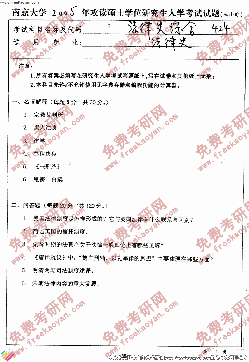 专业课考研经验 本站小编 FreeKaoyan 2018-01-22南京大学2005年考研真题-法理专业综合