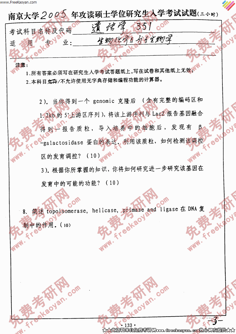 南京大学2005年考研真题-遗传学(3)