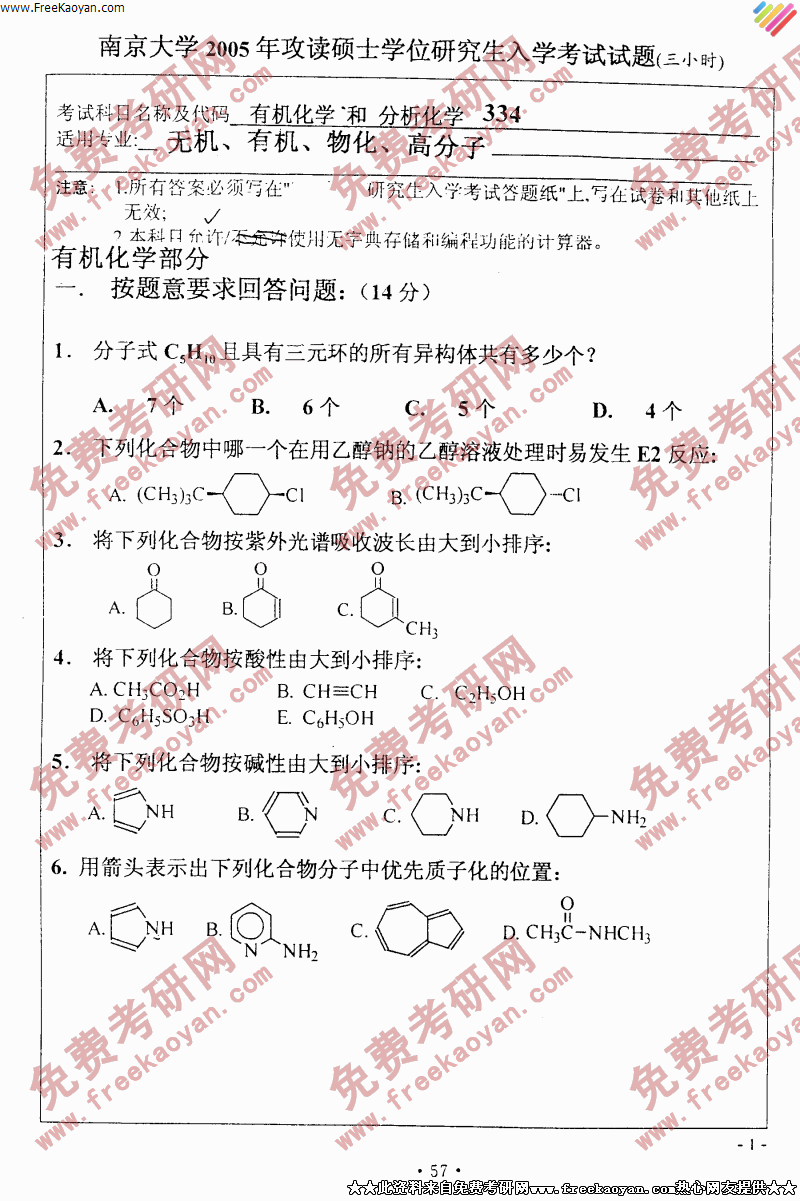 南京大学2005年考研真题-有机化学和分析化学