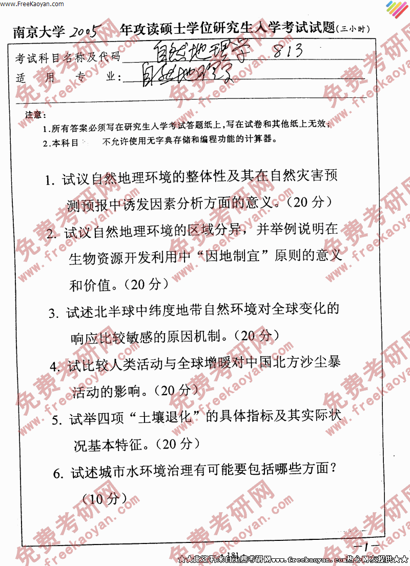 专业课考研经验 本站小编 FreeKaoyan 2018-01-22南京大学2005年考研真题-专业综合(气象学,大气物理与大气环境)