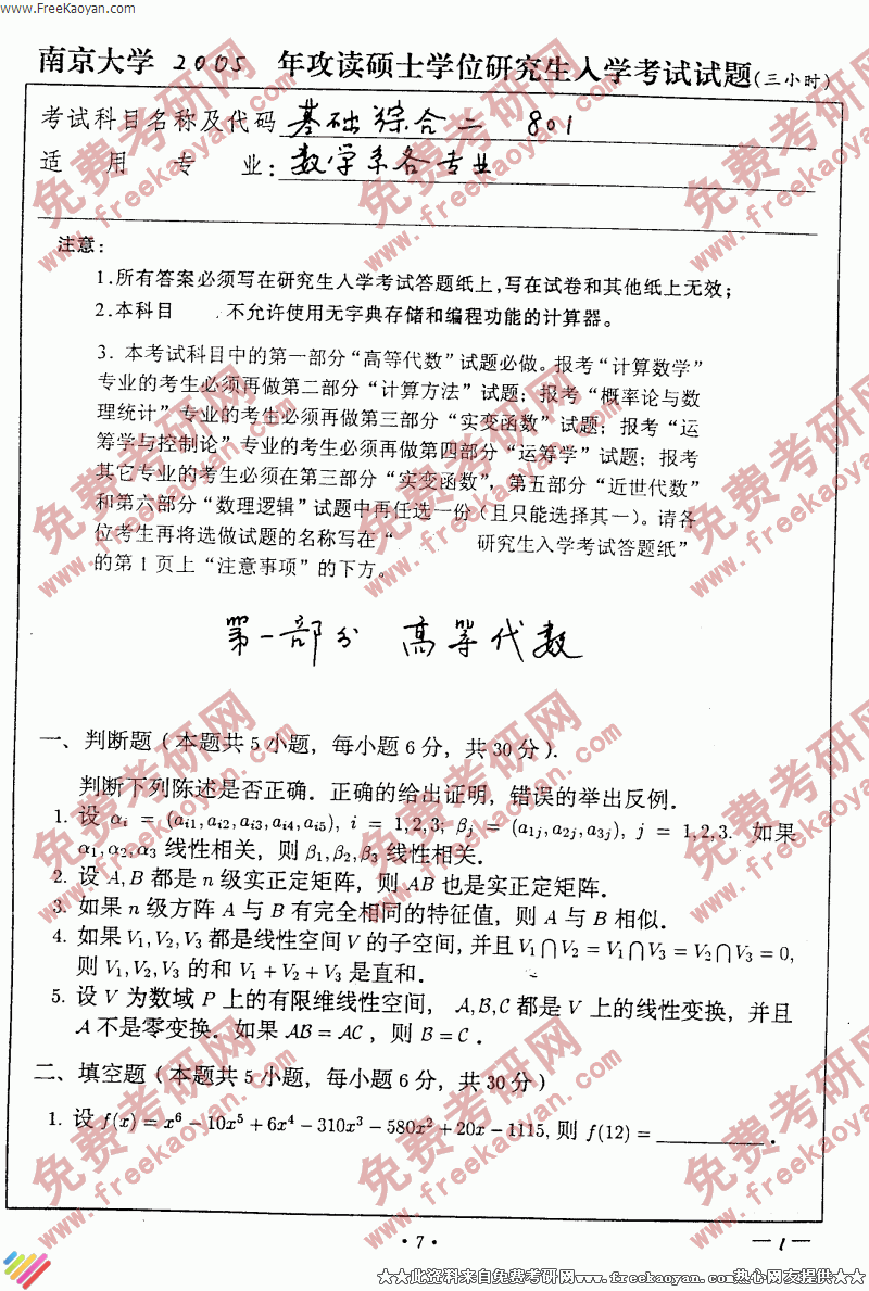 南京大学2005年考研真题-基础综合(二)(数学系各专业)