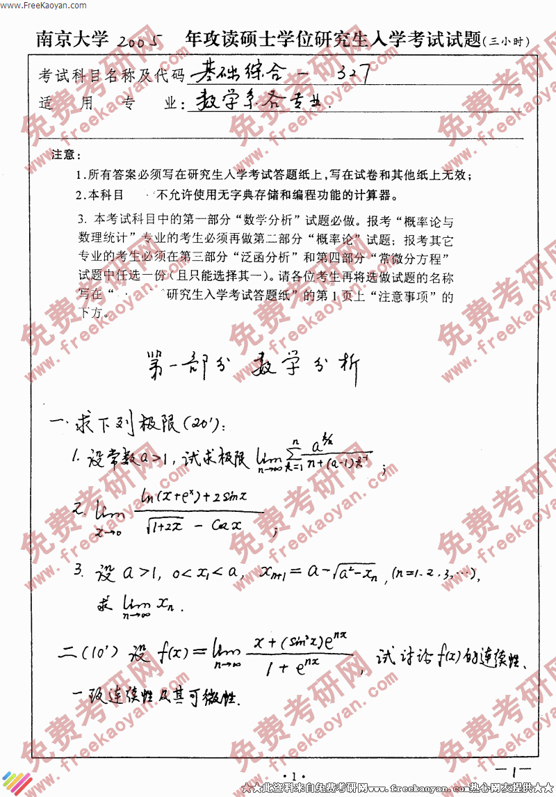 南京大学2005年考研真题-基础综合(一)(数学系各专业)