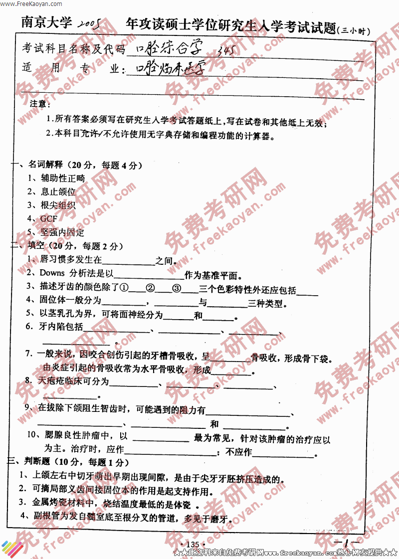 南京大学2005年考研真题-口腔综合学