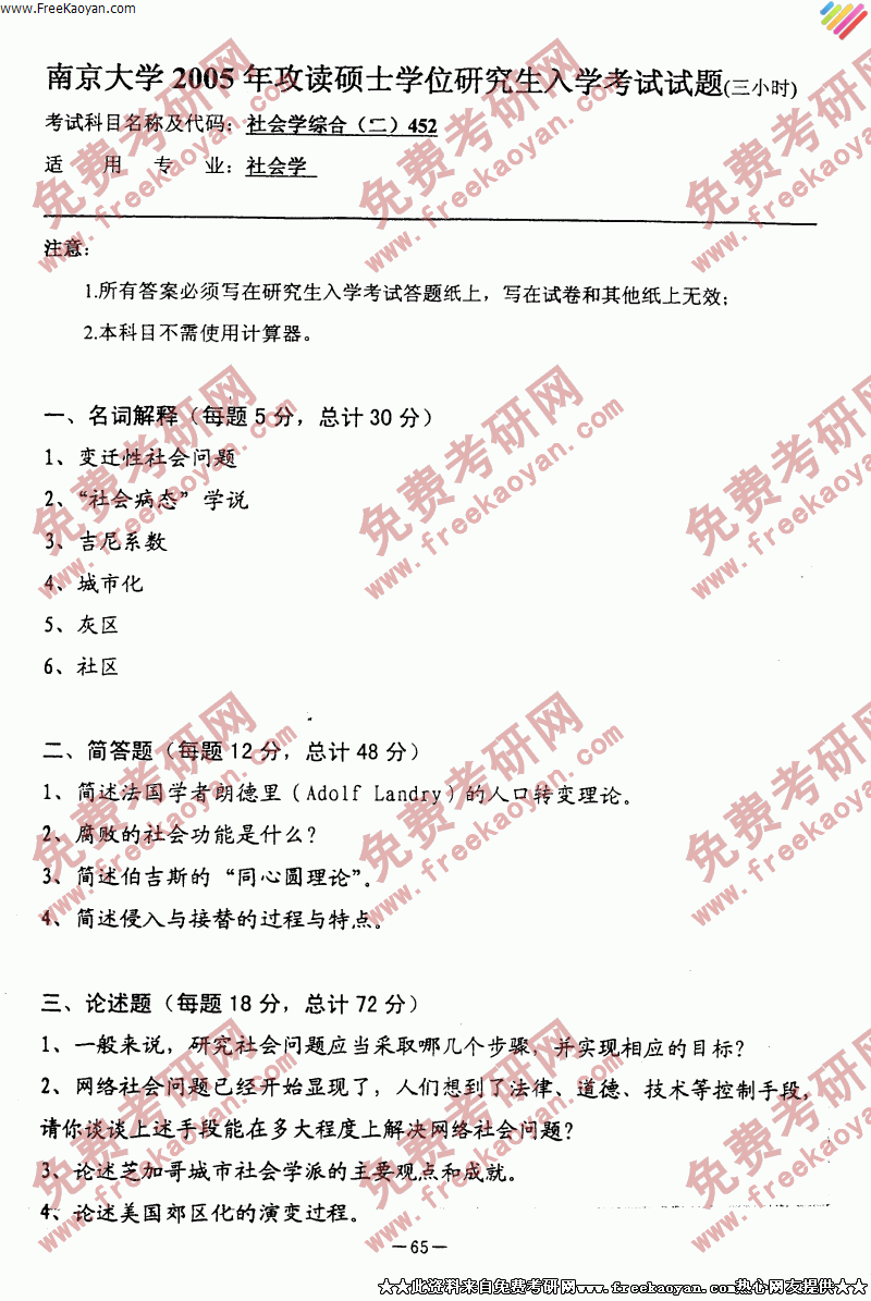 专业课考研经验 本站小编 FreeKaoyan 2018-01-22南京大学2005年考研真题-人口社会学
