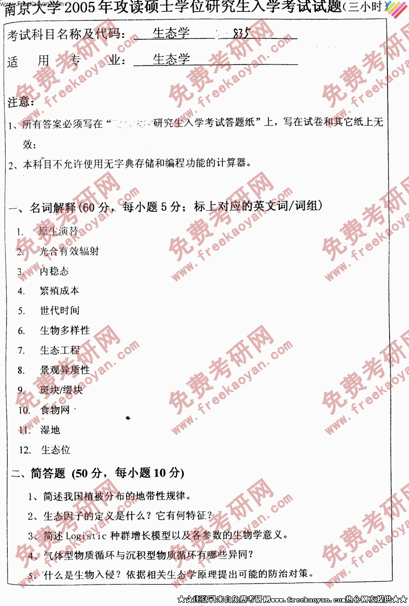专业课考研经验 本站小编 FreeKaoyan 2018-01-22南京大学2005年考研真题-普通生物学