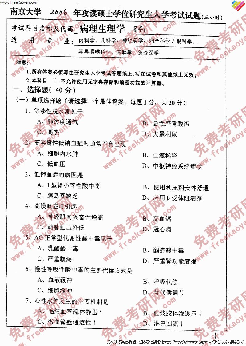 南京大学2006年考研真题-病理生理学(内科学,儿科学,神经病学,妇产科学,眼科学,耳鼻咽喉科学,麻醉学,急趁医学)