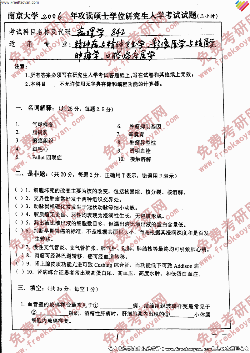 南京大学2006年考研真题-病理学(神经病与精神卫生学,影象医学与核医学,肿瘤学,口腔临床医学)