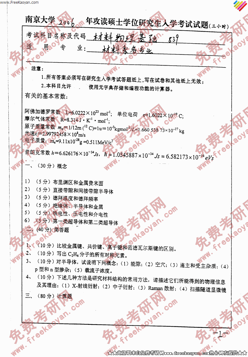 南京大学2006年考研真题-材料物理基础(材料系各专业)