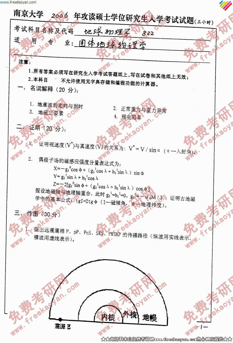 南京大学2006年考研真题-地球物理学(固体地球物理学)