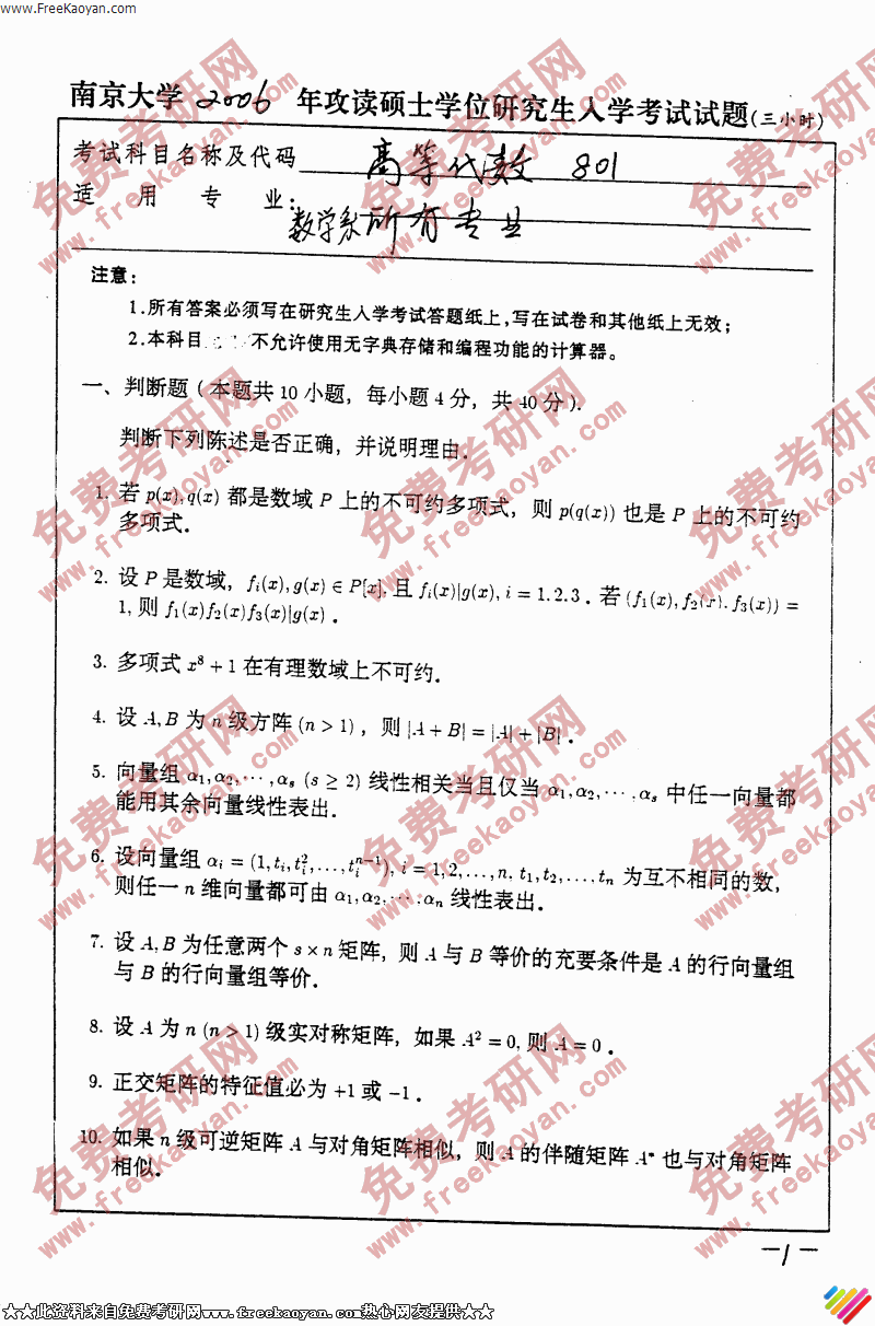 南京大学2006年考研真题-高等代数