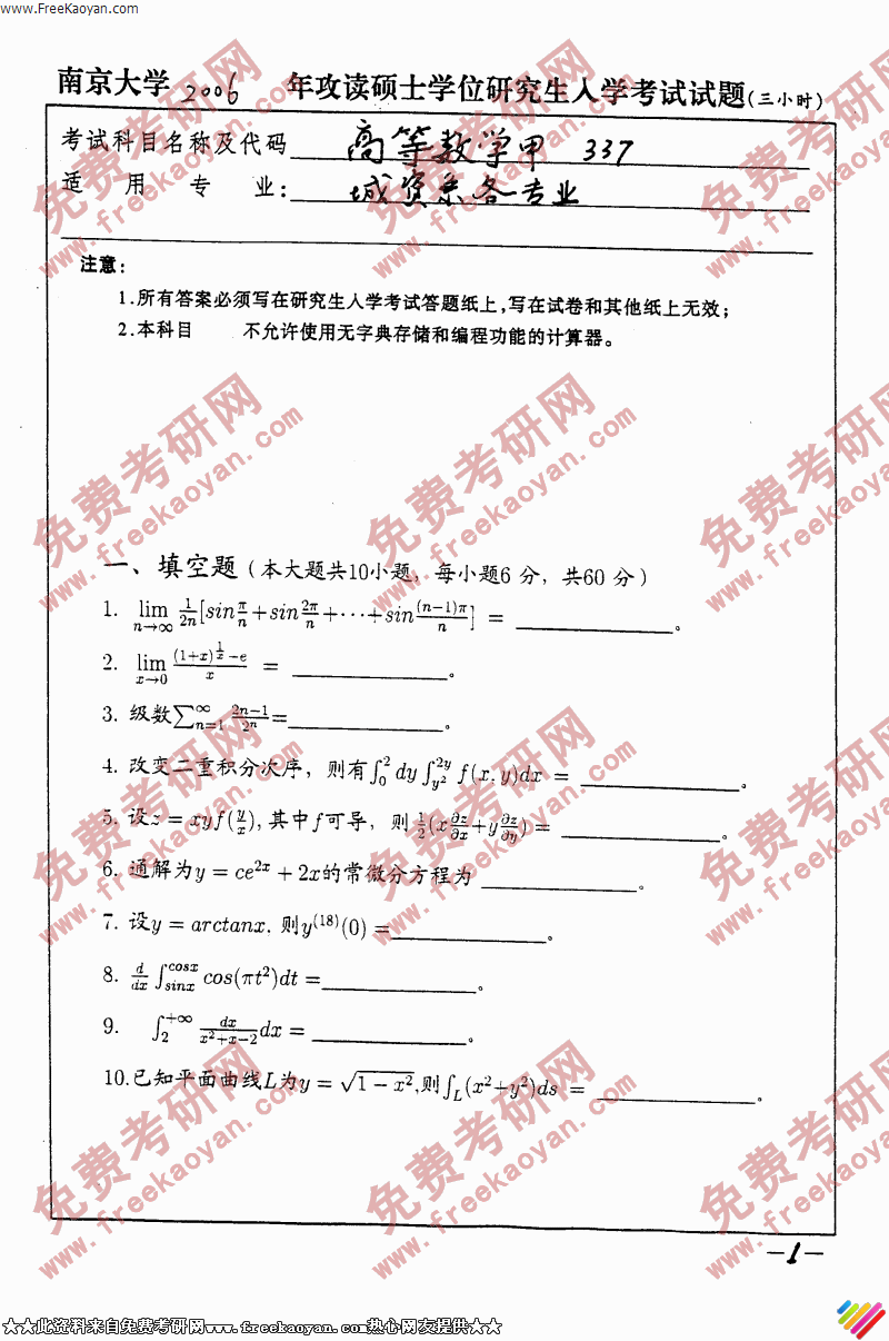 南京大学2006年考研真题-高等数学