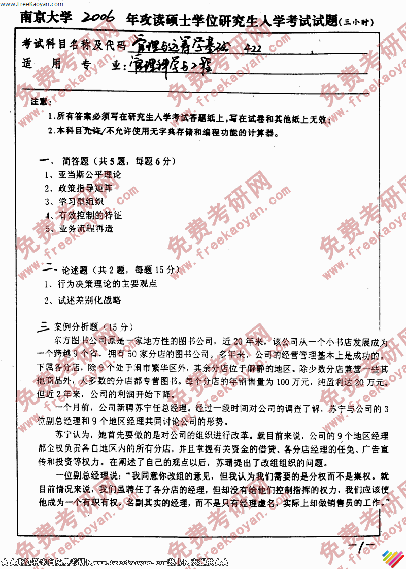 专业课考研经验 本站小编 FreeKaoyan 2018-01-22南京大学2006年考研真题-管理学与计算机基础