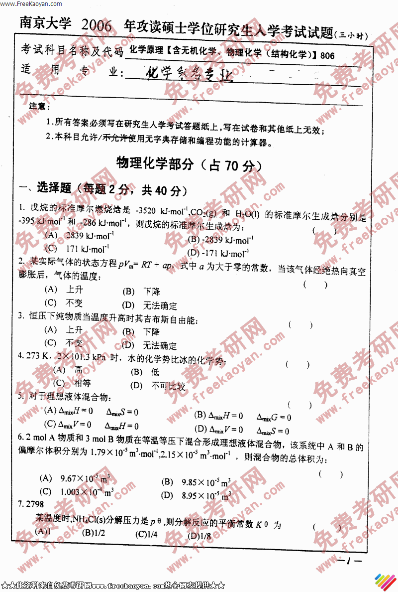 南京大学2006年考研真题-化学原理(含无机化学、物理化学(含结构化学)