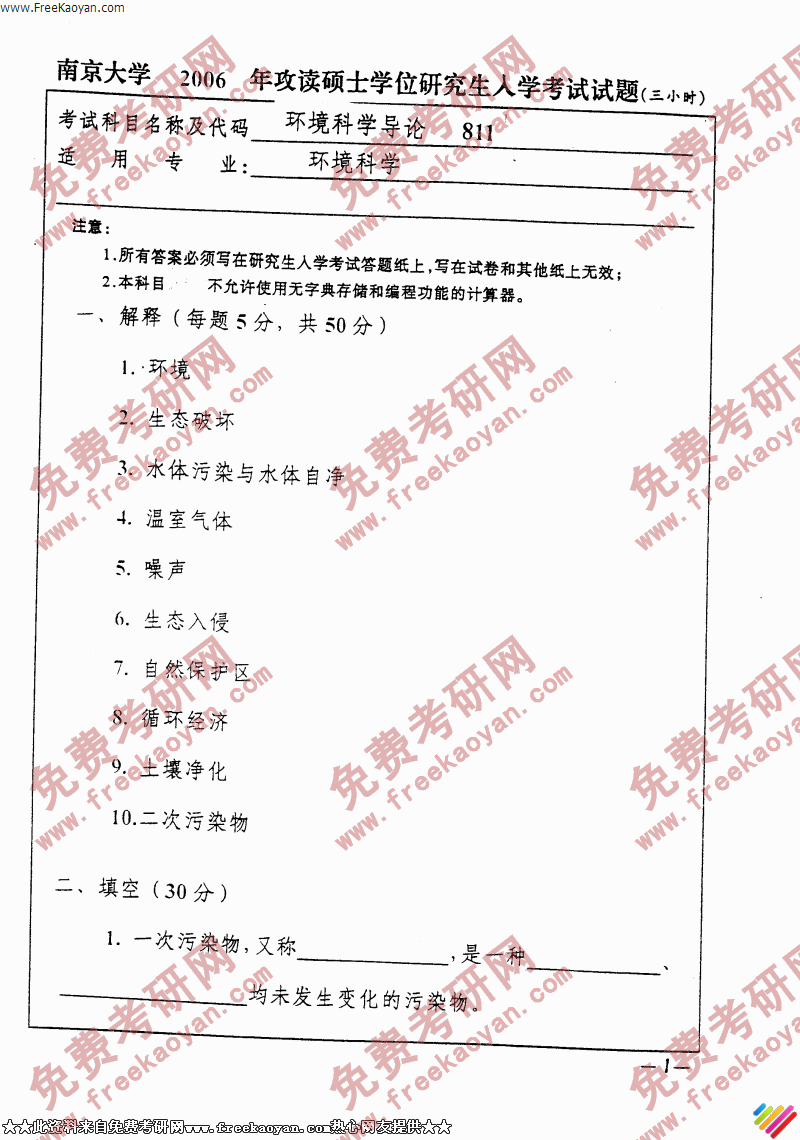 专业课考研经验 本站小编 FreeKaoyan 2018-01-22南京大学2006年考研真题-环境规划与管理