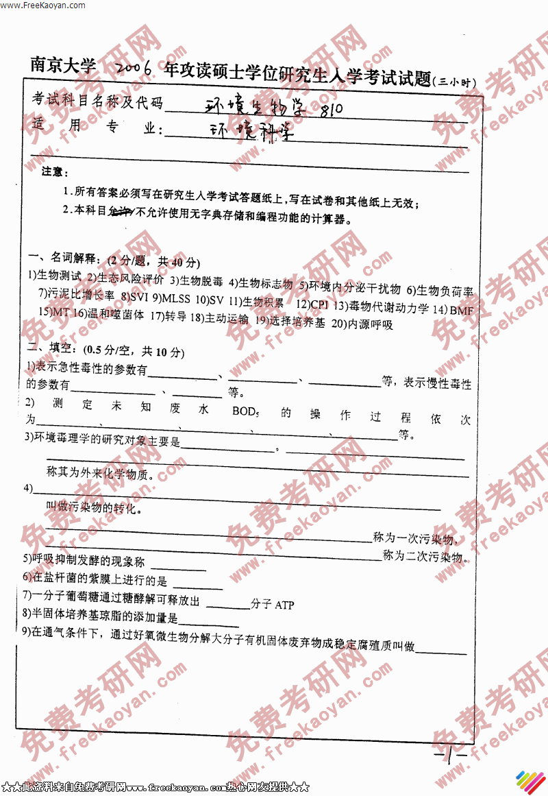 专业课考研经验 本站小编 FreeKaoyan 2018-01-22南京大学2006年考研真题-环境工程学