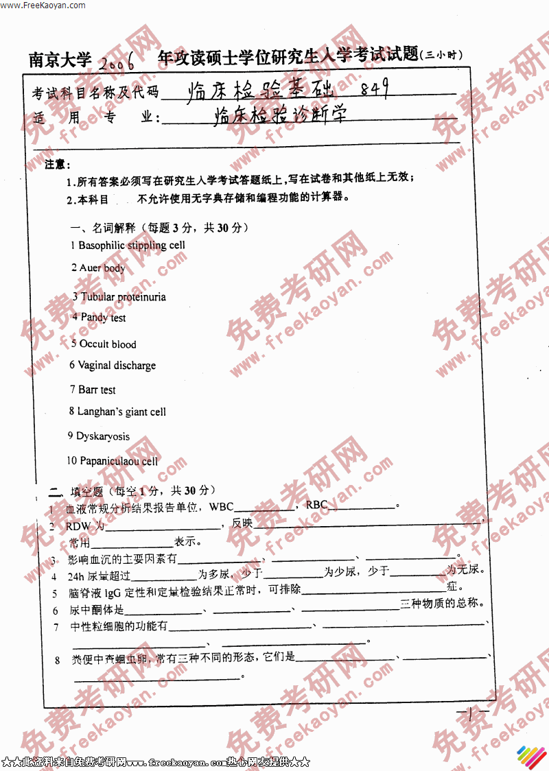 南京大学2006年考研真题-临床检验基础(临床检验诊断学)