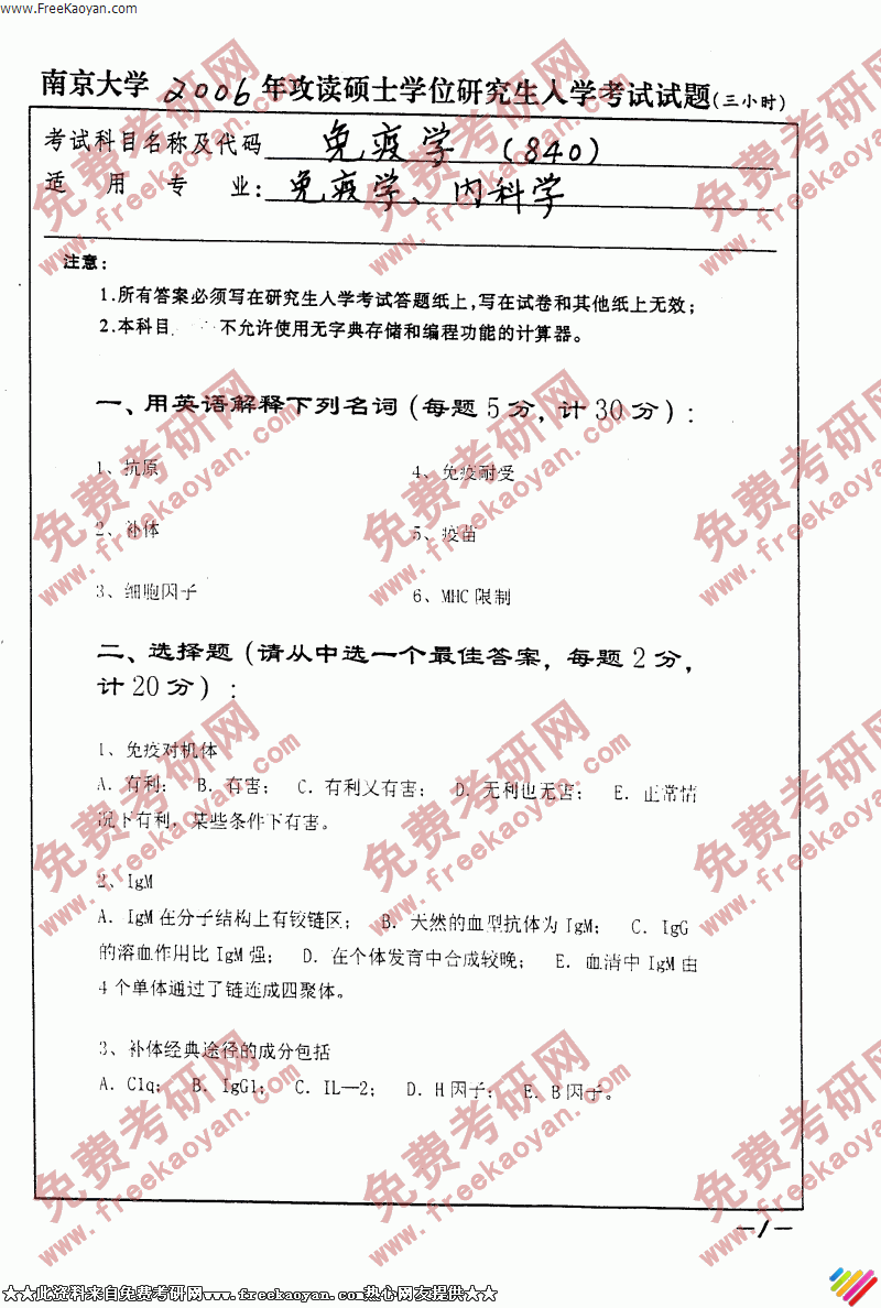 南京大学2006年考研真题-免疫学(免疫学,内科学)