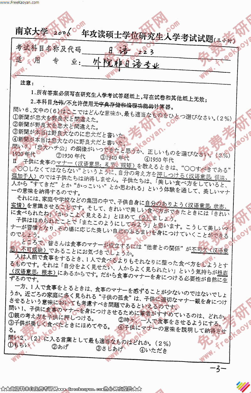 专业课考研经验 本站小编 FreeKaoyan 2018-01-22南京大学2006年考研真题-基础日语