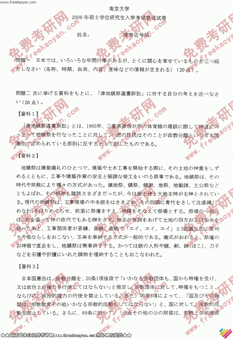 专业课考研经验 本站小编 FreeKaoyan 2018-01-22南京大学2006年考研真题-日语