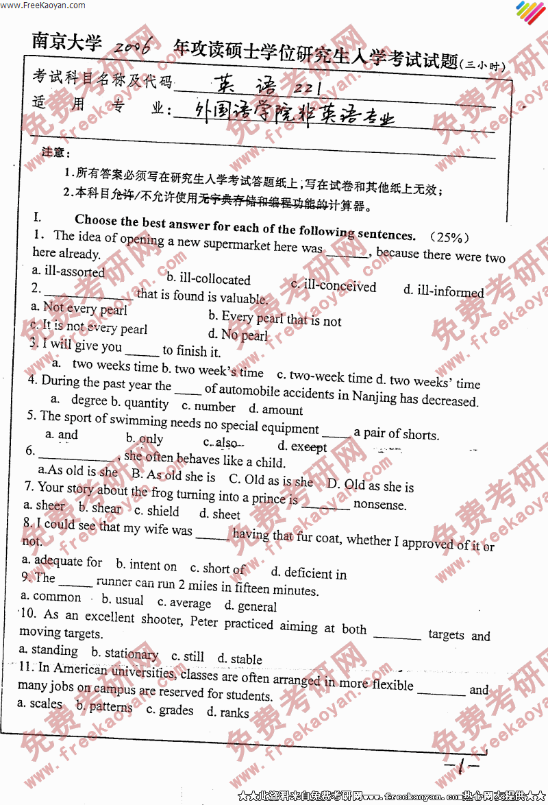 专业课考研经验 本站小编 FreeKaoyan 2018-01-22南京大学2006年考研真题-外国语学院英语系(英语综合能力)