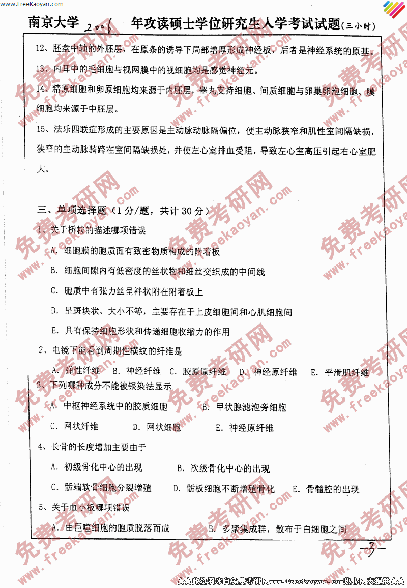 南京大学2006年考研真题-组织胚胎学(病理学与生理学)(3)