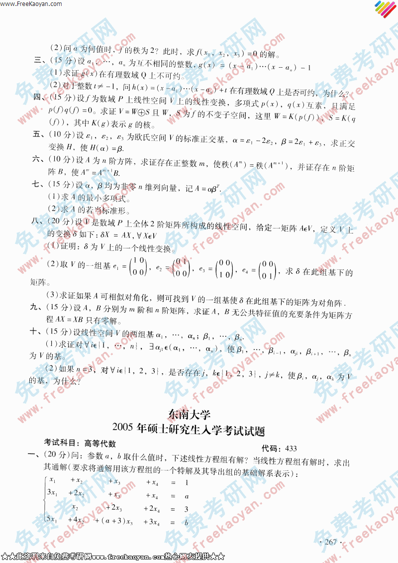 东南大学2005年考研真题-高等代数