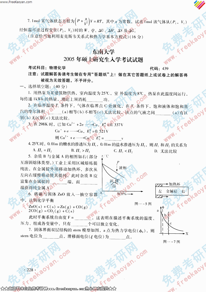 东南大学2005年考研真题-物理化学