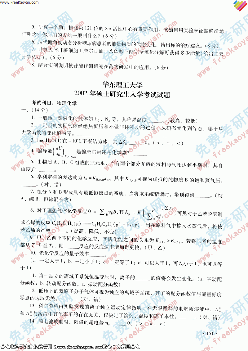 专业课考研经验 本站小编 FreeKaoyan 2018-01-22东南大学2005年考研真题-物理化学