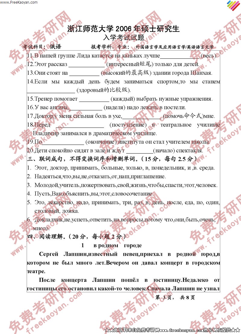 浙江师范大学2006年考研真题-二外俄语(3)