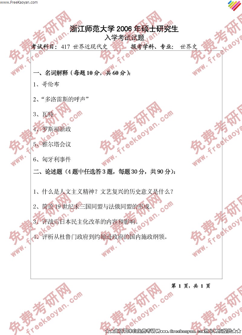 专业课考研经验 本站小编 FreeKaoyan 2018-01-22浙江师范大学2006年考研真题-历史教学综合基础