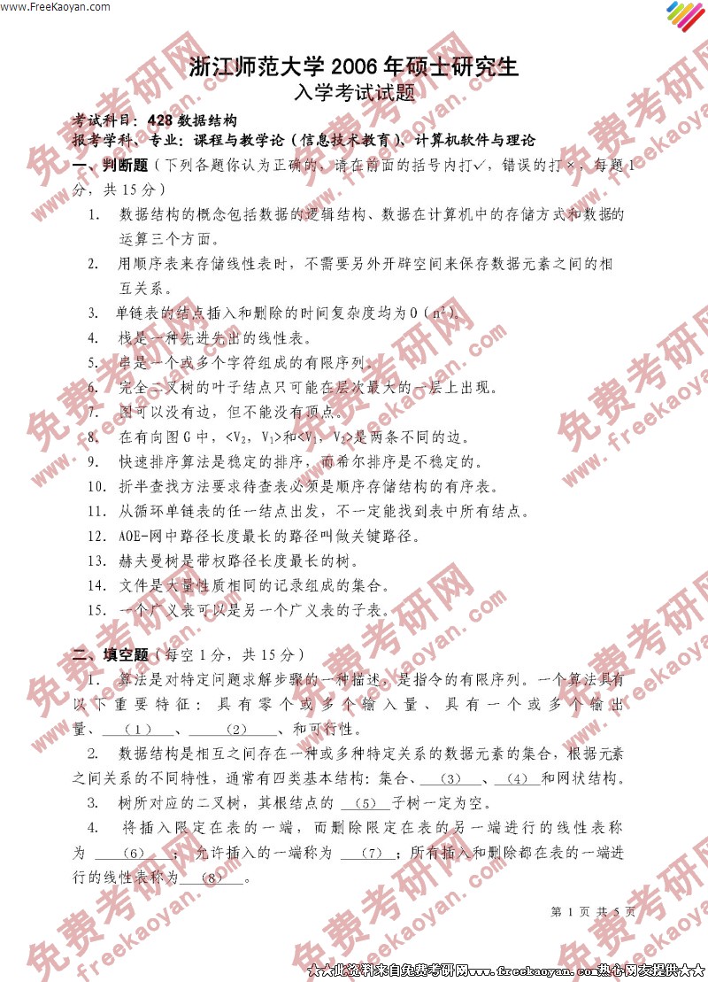 专业课考研经验 本站小编 FreeKaoyan 2018-01-22浙江师范大学2006年考研真题-计算机应用基础