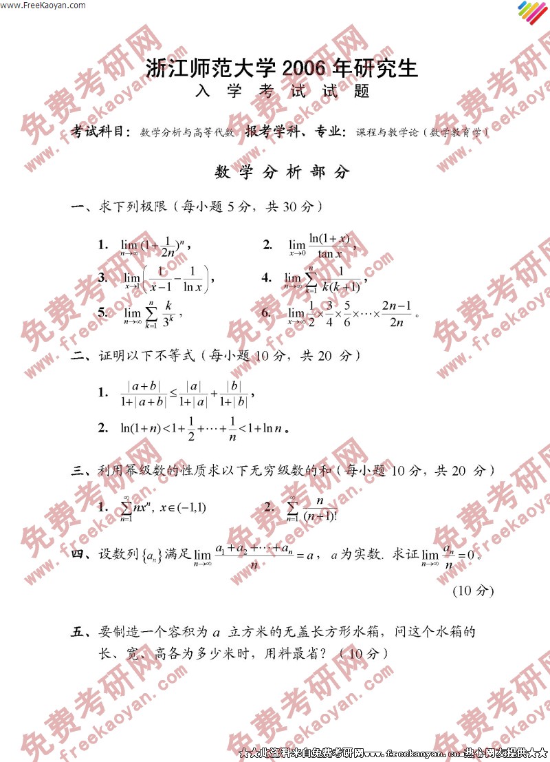 专业课考研经验 本站小编 FreeKaoyan 2018-01-22浙江师范大学2006年考研真题-数学分析